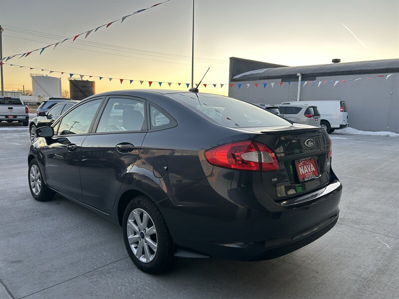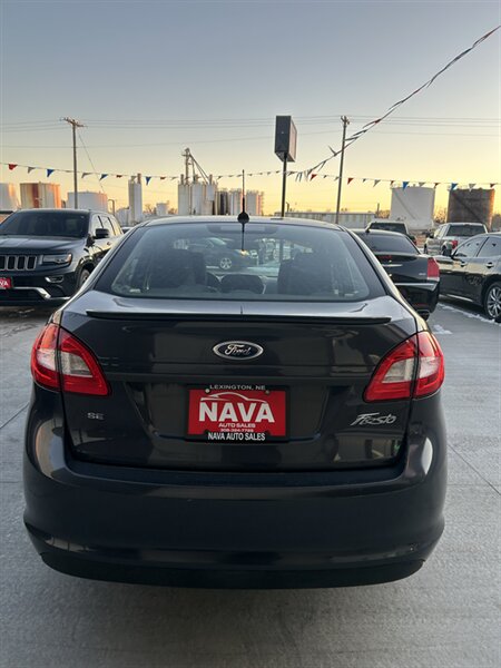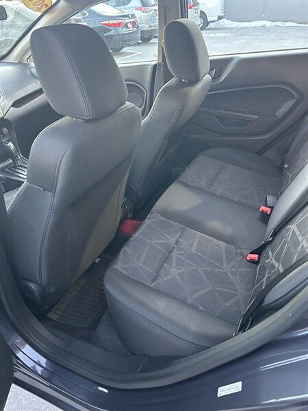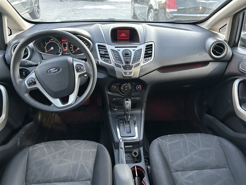 2012 Ford Fiesta SE powered by a 1.6L I4 producing 120 hp and 112 lb-ft of torque. Factory-equipped SE convenience features include cloth seating for five, manual air conditioning, power windows and door locks, remote keyless entry, cruise control and tilt steering, an AM/FM/CD/MP3 stereo with auxiliary and USB inputs plus Ford SYNC connectivity, and 60/40 split-folding rear seats for increased cargo flexibility. Standard safety equipment includes anti-lock brakes, electronic traction and stability control, and multiple airbags (front and side curtain) for occupant protection.