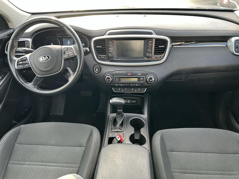 2020 Kia Sorento S V6 — powered by a 3.3L V6 producing 290 hp and 252 lb-ft of torque. Factory-standard equipment includes an eight-speed automatic transmission (FWD standard, AWD available), seating for up to seven with folding second- and third-row seats, 18-inch alloy wheels, cloth upholstery, full power accessories, remote keyless entry and cruise control. Interior tech features an 8-inch touchscreen with Apple CarPlay and Android Auto, Bluetooth, USB ports and a six-speaker audio system. Standard safety and convenience items include a rearview camera, ABS, electronic stability and traction control and a full complement of airbags.